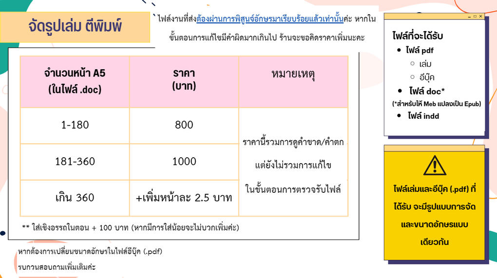 // โปรดอ่านก่อนจองคิว //1. เมื่อลูกค้าสนใจจองคิว ทางร้านจะเก็บค่ามัดจำคิว 200 บ./คิว *สามารถเลื่อนคิวได้ ถ้ามีคิวว่าง แต่ถ้ายกเลิกคิวไม่คืนมัดจำและขึ้น Blacklist ค่ะ2. เมื่อถึงคิว หลังจากลูกค้าส่งไฟล์ทุกอย่างแล้ว ทางร้านจะจัดตัวอย่างอาร์ตให้ดูก่อน เมื่อลูกค้าคอนเฟิร์มอาร์ตเรียบร้อยทางร้านถึงจะจัดเล่มทั้งหมด *ซึ่งหากมีการปรับเปลี่ยนรายละเอียดอาร์ตต่าง ๆ หลังจากนี้ ทางร้านจะคิดค่าบริการเพิ่ม3. หากมียอดรวมจัดเกิน 1500 บ. ร้านจะแบ่งให้ชำระค่าจ้าง 2 รอบ โดยรอบที่ 1 ชำระพร้อมคอนเฟิร์มอาร์ต และรอบที่ 2 ชำระตอนตรวจรับงาน หรือทางลูกค้าจะชำระเต็มก่อนจัดงานก็ได้ค่ะ4. หลังจากชำระเงินค่าจ้างแล้ว ทางร้านจะจัดหน้าทั้งหมดให้ แล้วส่งให้ตรวจไฟล์ทางกูเกิ้ลไดร์ฟ โดยจะใส่ลายน้ำในไฟล์ เพื่อป้องกันลูกค้านำไฟล์ไปใช้ *ถ้ามีการแก้ขนาดอักษร จำนวนบรรทัด ระยะขอบกระดาษ หรือการเพิ่มเนื้อหาหลังจัดเสร็จจะมีค่าใช้จ่ายเพิ่ม5. ถ้ามีการแก้คำผิด/แก้ประโยค หากมีมากเกินไปอาจมีค่าบริการเพิ่มเติมเล็กน้อยค่ะ เมื่อทางร้านแก้ไขเสร็จ จะให้ลูกค้าชำระยอดที่เหลือทั้งหมดค่ะ เมื่อได้รับยอด ทางร้านจะส่งไฟล์ทั้งหมดให้ทางกูเกิ้ลไดร์ฟ *โดยร้านจะเก็บไฟล์ไว้ 30 วัน พอครบกำหนดจะลบออกจากไดร์ฟค่ะ*เมื่อลูกค้าจ่ายมัดจำจองคิว ร้านจะถือว่าลูกค้าอ่านและยอมรับสัญญาข้อตกลงการว่าจ้างงานทั้งหมดแล้ว**สำหรับลูกค้าที่ชำระค่าจ้างไม่ครบ จะไม่ได้รับไฟล์ทุกกรณี และลูกค้าที่ยังอยู่ในขั้นตอนการตรวจรับงาน รบกวนตรวจงานให้เสร็จภายใน 30 วันค่ะ หากลูกค้ายังไม่คอนเฟิร์มภายในเวลาที่กำหนด ร้านจะส่งไฟล์ไฟนอลเป็นไฟล์แบบที่ไม่ผ่านการตรวจแก้ให้นะคะ***ราคาและขั้นตอนต่าง ๆ อาจมีการเปลี่ยนแปลงได้ตามดุลยพินิจของทางร้านค่ะ